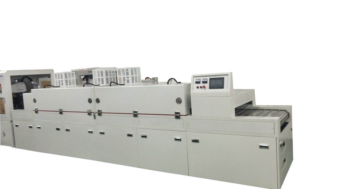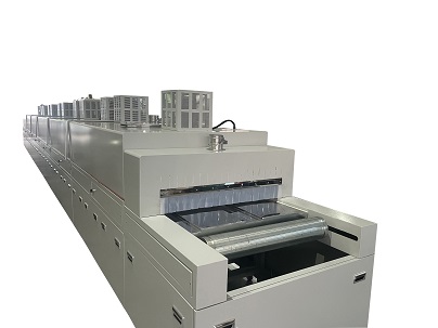2、三個溫區分兩節爐蓋。產品進料高度為220mm、進料寬度為870mm,出口段內部高度為790mm(配3個自動升降門);烘干部分總長3350mm,